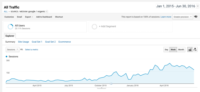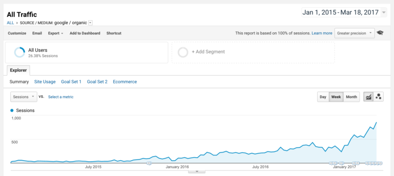 Траффик неуклонно рос вплоть до 2016 г., когда я работал над контентом, создавая страницы, которые обладали бы ценностью для поисковых систем и многое другое.